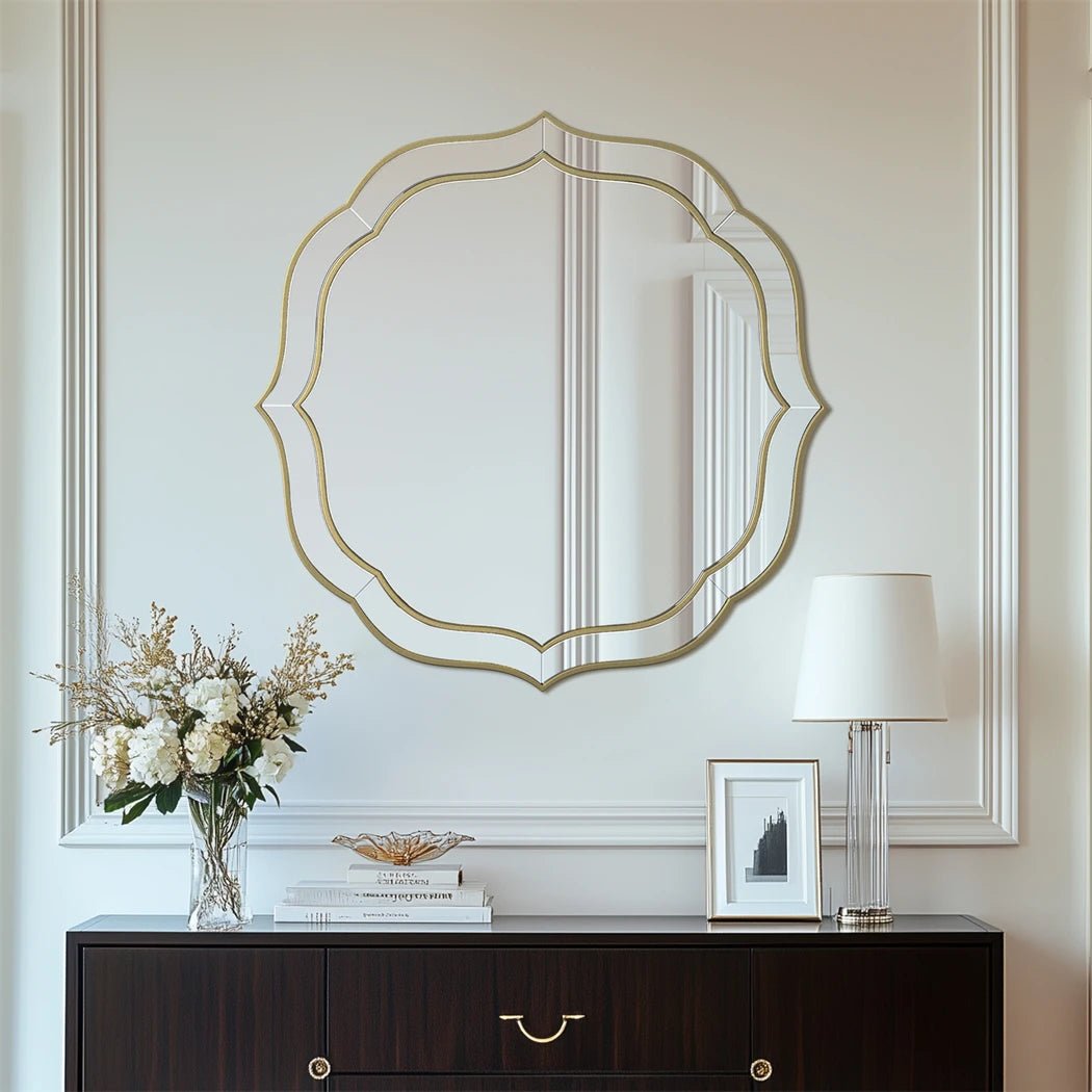 Son cadre festonné en or clair et son verre biseauté haut de gamme font de ce miroir un véritable chef-d'œuvre décoratif. Avec ses dimensions généreuses de 80 x 80 cm, il s’impose comme un point focal dans n’importe quelle pièce : salon, chambre, entrée ou salle à manger.